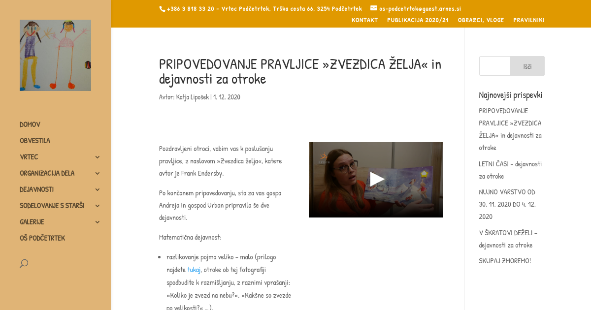 Pozdravljeni otroci, vabim vas k poslušanju pravljice, z naslovom »Zvezdica želja«, katere avtor je Frank Endersby.