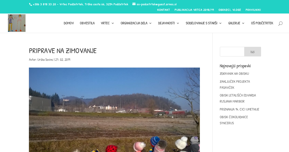 V prvem oddelku smo se aktivno začeli pripravljati na zimovanje že v mesecu januarju. Izvedli smo več vadbenih ur na stadionu in v igralnici, izvajali vaje za moč, se preizkusili v podrsavanju s smučmi, ter hodili na daljše sprehode in pohode. Pomerili smo tudi smučarsko opremo, sedaj pa že nestrpno čakamo na ponedeljek, 4. 3. 2019, da se odpeljemo z avtobusom na Ribnico na Pohorju.