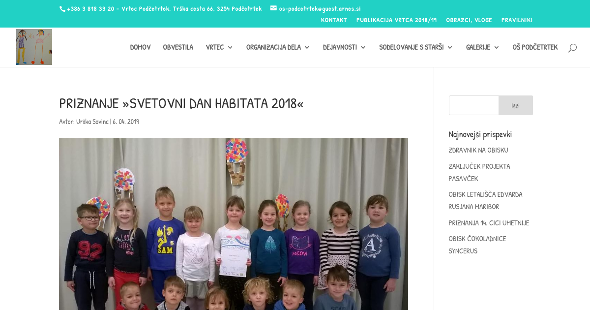 Septembra 2018 smo v 1. oddelku spoznavali svoj kraj, ter se udeležili natečaja »Arhitekturna dediščina okoli nas«, ki ga je razpisal Center arhitekture Slovenije. Izdelali smo plakat s starejšimi stavbami v Podčetrtku. Za svoje delo smo prijeli priznanje Centra arhitekture Slovenije. Na prejeto priznanje smo ponosni, saj smo tako prispevali delček v mozaik zavedanja o pomenu arhitekture in prostora v vsakodnevnem življenju.