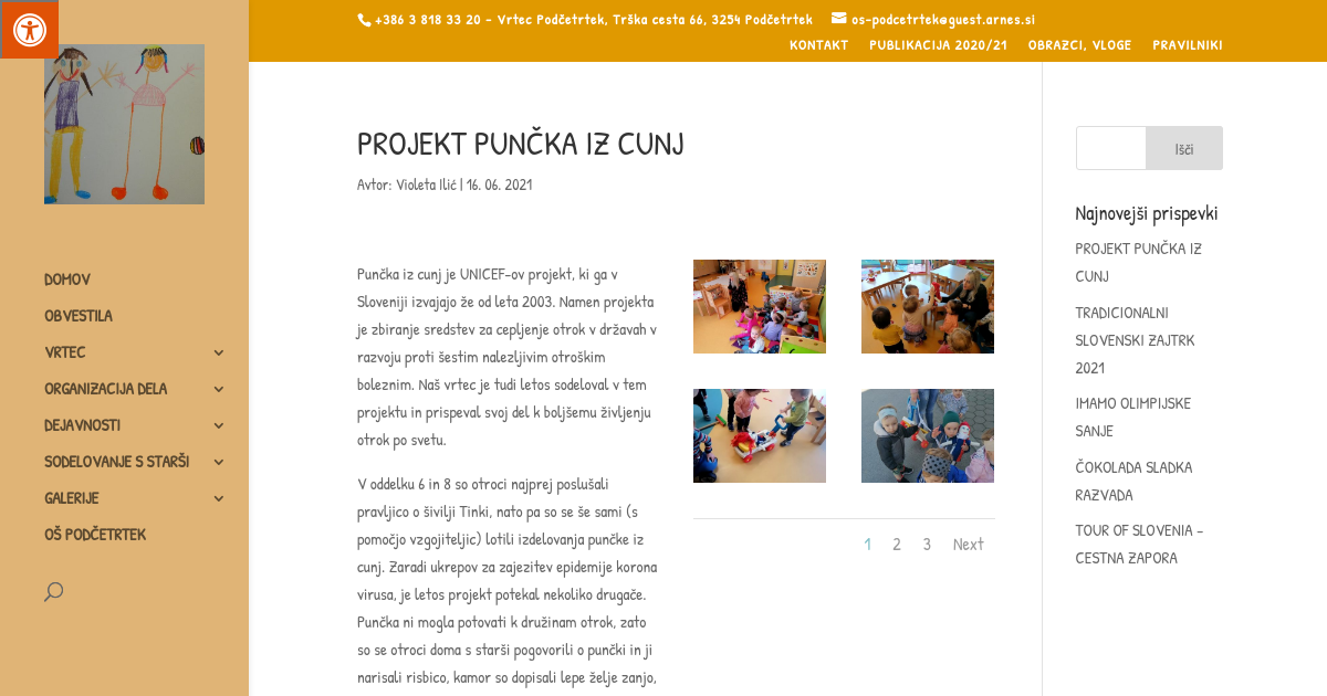 Punčka iz cunj je UNICEF-ov projekt, ki ga v Sloveniji izvajajo že od leta 2003. Namen projekta je zbiranje sredstev za cepljenje otrok v državah v razvoju proti šestim nalezljivim otroškim boleznim. Naš vrtec je tudi letos sodeloval v tem projektu in prispeval svoj del k boljšemu življenju otrok po svetu.