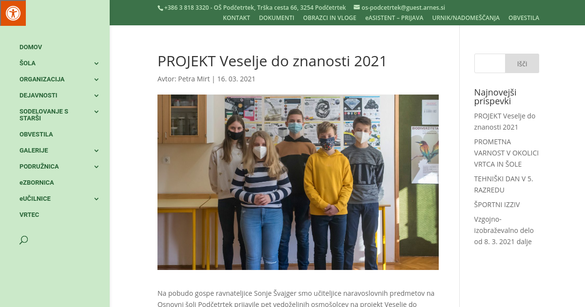 Na pobudo gospe ravnateljice Sonje Švajger smo učiteljice naravoslovnih predmetov na Osnovni šoli Podčetrtek prijavile pet vedoželjnih osmošolcev na projekt Veselje do znanosti 2021.