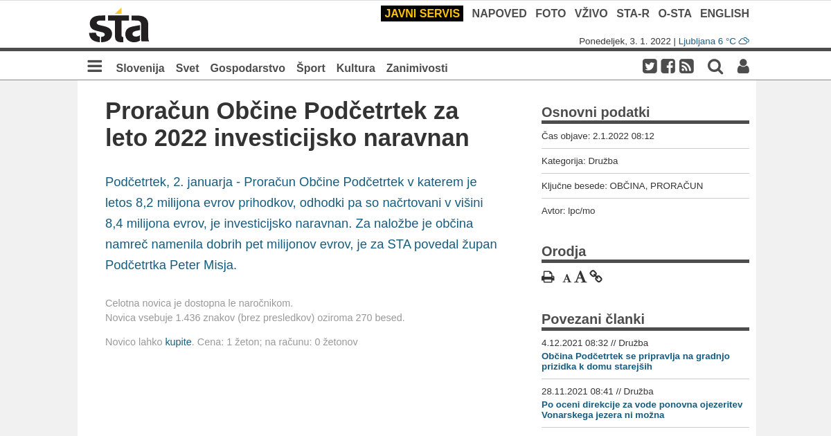 Proračun Občine Podčetrtek v katerem je letos 8,2 milijona evrov prihodkov, odhodki pa so načrtovani v višini 8,4 milijona evrov, je investicijsko naravnan. Za naložbe je občina namreč namenila dobrih pet milijonov evrov, je za STA povedal župan Podčetrtka Peter Misja.