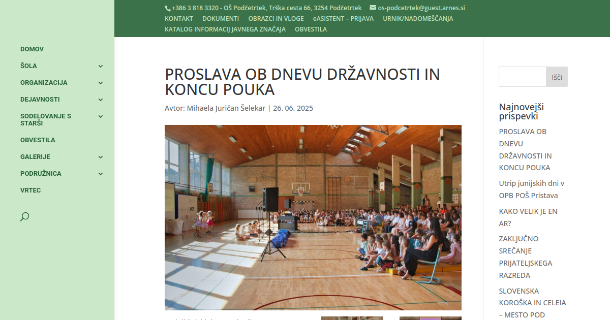 Zadnji šolski dan, 24. junija 2025, smo se v šolski telovadnici zbrali učenci in učitelji matične ter podružnične šole na proslavi ob dnevu državnosti in prihajajočih poletnih počitnicah. S kulturno prireditvijo smo obeležili pomemben praznik in se hkrati poslovili od še enega uspešnega šolskega leta.