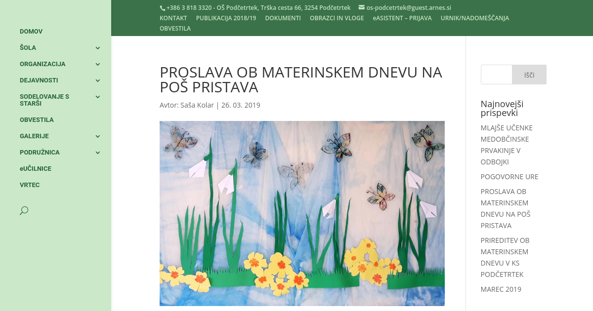 V soboto, 23. 3. 2019, so učenci POŠ Pristava pri Mestinju zablesteli na proslavi ob dnevu žena in materinskem dnevu. S svojo energijo in otroško igrivostjo so se predstavili svojim staršem, starim staršem in drugim. Obiskovalci proslave so uživali v deklamacijah in dramskih igrah ter ob petju otroškega pevskega zbora.