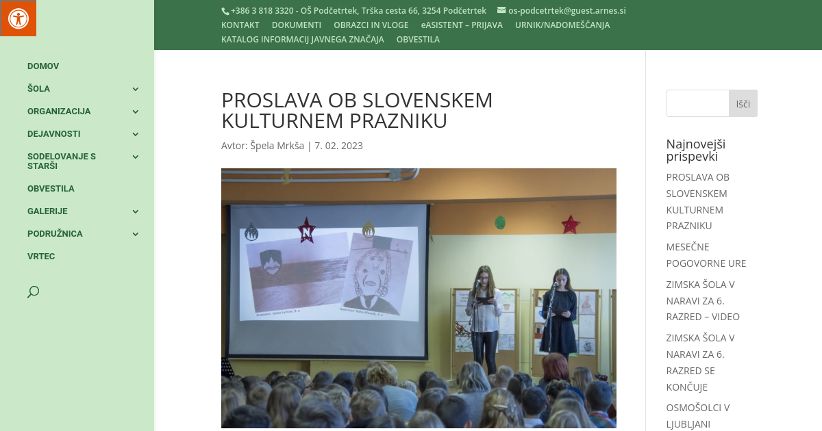 V torek, 7. 2. 2023, smo se učenci in učitelji OŠ Podčetrtek poklonili slovenski kulturi in obeležili Prešernov dan. Spomnili smo se našega največjega pesnika Franceta Prešerna, ki je slovenski jezik in književnost postavil ob bok svetovni literaturi. Slovenska narodna identiteta se je začela z ljudskim izročilom – z ljudskim slovstvom. Na letošnji proslavi smo učencem in učiteljem približali del tega bogastva. Interpretacije ljudskega slovstva na odru so na ekranu spremljali likovni motivi le teh. (besedilo: Bernarda Ošlak) (fotografije: Borut Pihlar)