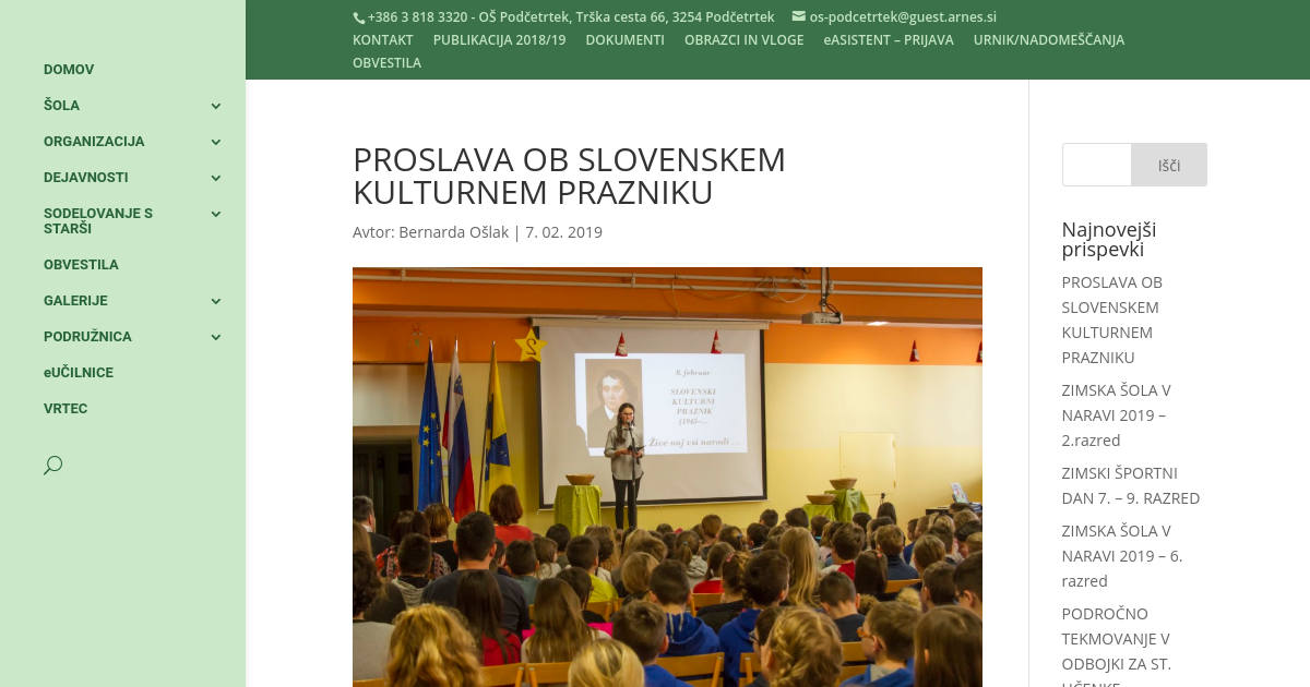 V četrtek, 7. februarja 2019, je v OŠ Podčetrtek potekala proslava ob slovenskem kulturnem prazniku. V mesecu februarju posebno pozornost namenjamo slovenski kulturi, kajti skozi vso zgodovino smo se je Slovenci močno oklepali, saj je bila vir naše narodne identitete. Slovenski kulturi smo se poklonili z deklamacijami in dramatizacijo Prešernove poezije, z baletom, pesmijo in instrumentalno glasbo. Ob tem smo se učili poslušati kulturo v sebi in izkoristiti priložnosti, ko se ona, kultura, približa nam.