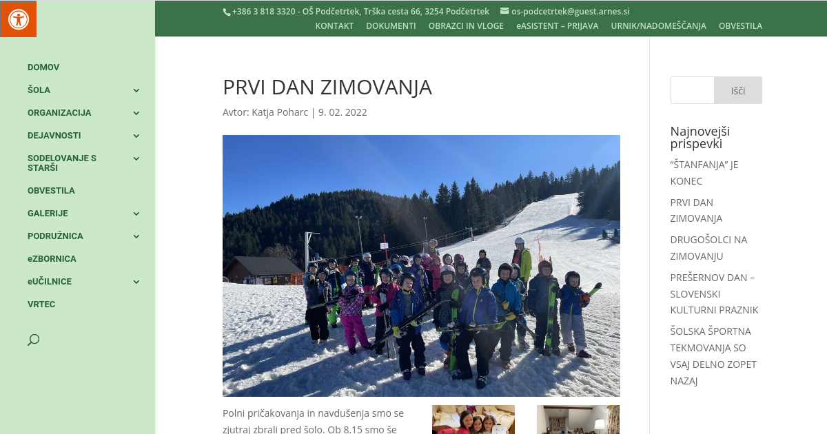 Polni pričakovanja in navdušenja smo se zjutraj zbrali pred šolo. Ob 8.15 smo še zadnjič pomahali staršem in se odpravili proti Ribnici na Pohorju. Po zanimivi dvourni vožnji smo prispeli do naših apartmajev, ki so nas popolnoma navdušili. Otroci so očarani nad velikostjo in urejenostjo apartmajev. Hitro so si poiskali svoja ležišča in začeli raziskovati. Po slastnem kosilu je sledil počitek, po njemu pa že prvi preizkus smučarske proge. Z iskricami v očeh so poslušali svoje učitelje in črpali nova znanja. Pozno popoldan so se seznanili še s pravili v zimski šoli v naravi in varnostjo na smučišču. Nato so odšli na zasluženo večerjo. Po večerji so se družili ob igranju družabnih iger in prepevanju. S prijetnimi vtisi prvega dne smo se odpravili spat.