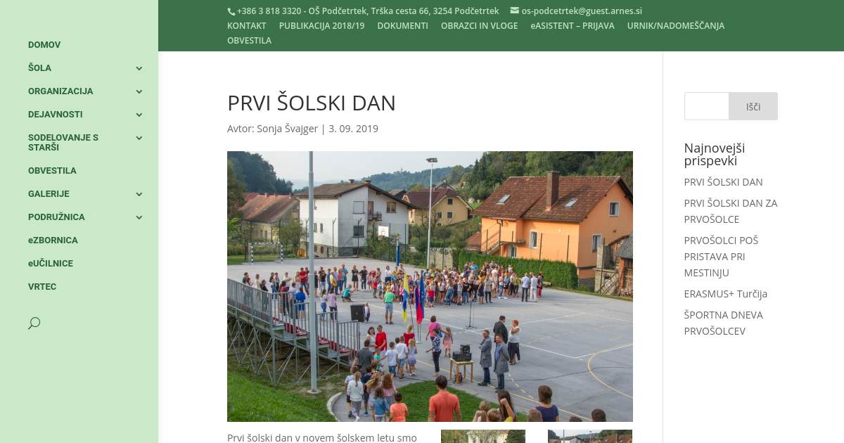 Prvi šolski dan v novem šolskem letu smo na OŠ Podčetrtek začeli zelo svečano. Po 15 letih OŠ Podčetrtek zopet obiskuje čez 300 učencev. Na matični šoli je prvič prestopilo šolski prag 24 prvošolcev, na podružnični šoli v Pristavi pri Mestinju pa 9. Skupaj z županom občine Podčetrtek, gospodom Petrom Misjo, učenci in s starši smo se veselili tudi na novo urejene okolice matične šole, učilnice na prostem, sklopa zunanjih igral, ter pokrite terase in povečane igralnice vrtca v Pristavi pri Mestinju.