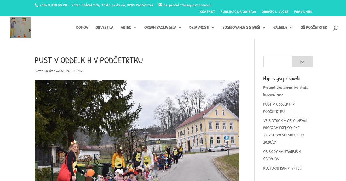 Tralala hopsasa pustne smo šeme, tralala hopsasa nič nismo lene … V torek, 25. 2. 2020, so naš vrtec namesto otrok, obiskale raznovrstne pustne šeme.Ob deseti uri smo se zbrali pred vrtcem in se skupaj odpravili na pustno povorko po kraju. Obiskali smo tudi dom upokojencev enota Podčetrtek, ter občino Podčetrtek. Skupaj smo s pesmijo in dobro voljo pregnali zimo in klicali pomlad.