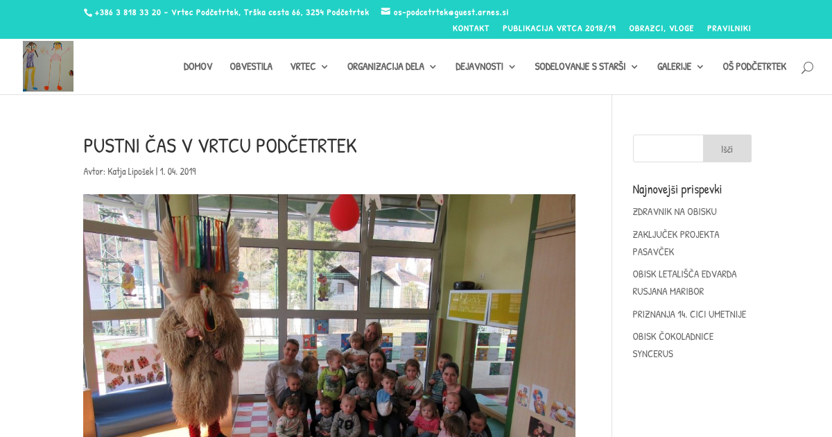 Pustni čas je v vrtec Podčetrtek prinesel veliko nasmejanih lic. V pustnem tednu so po oddelkih potekale razne pustne dejavnosti. Strokovne delavke so skozi različne aktivnosti motivirale otroke, da so: izdelali pustno dekoracijo v igralnicah, v garderobah, izdelovali pustne maske, obiskal nas je tudi kurent, prepevali smo razne pustne pesmi.