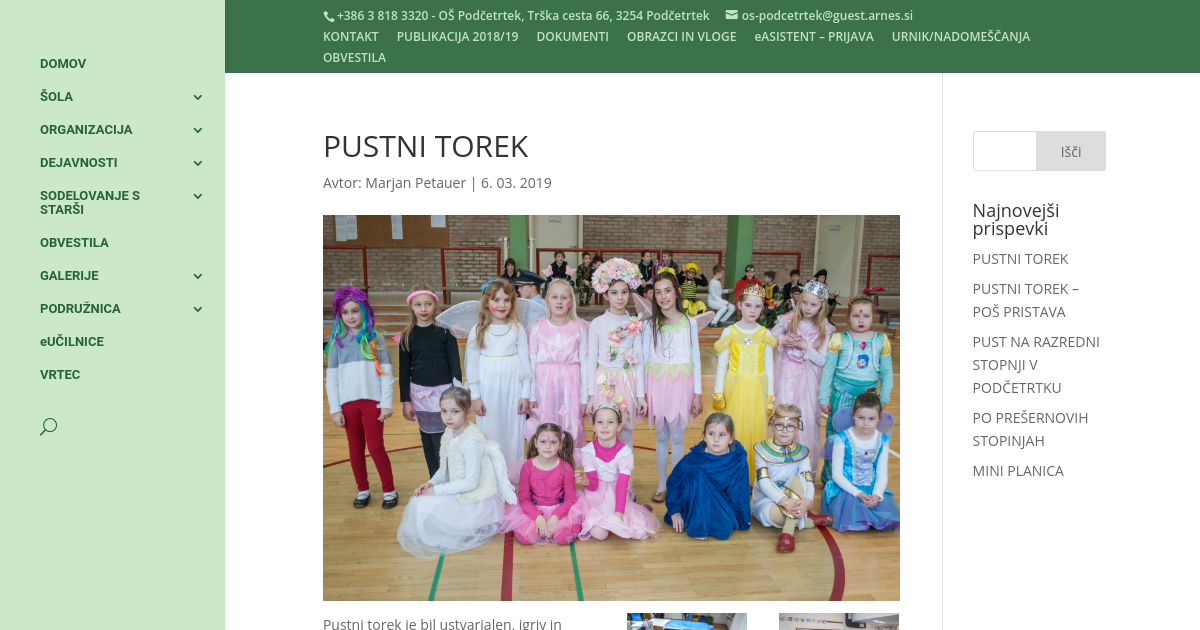 Pustni torek je bil ustvarjalen, igriv in zabaven. V šolo so navsezgodaj zjutraj prihajale nasmejane maškare v izvirnih preoblekah in širile veselje po šoli. Veliko je bilo super junakov, princes, kraljic in vil. Učenci predmetne stopnje so se prvi dve učni uri maskirali in pripravljali program, učenci razredne stopnje pa so se veselili in rajali v telovadnici. Sledil je skupni pustni pohod po Podčetrtku skozi Terme Olimia in nazaj, kjer so se maškare pokazale krajanom in turistom. Pustovanje smo nadaljevali s programom, v katerem so se učenci v okviru razredov predstavili s krajšo točko. Videli smo plesalke, plesalce, samoroge, smkce, fortnitovce, zombije, klovne, komunalne odpadke, .. Sledil je pustni ples.