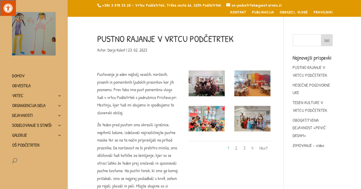 Pustovanje je eden najbolj veselih, norčavih, pisanih in pomembnih ljudskih praznikov kar jih poznamo. Prav tako ima pust pomembno vlogo tudi v vrtcu Podčetrtek s podružnico Pristava pri Mestinju, kjer tudi mi obujamo in spodbujamo ta slovenski običaj.