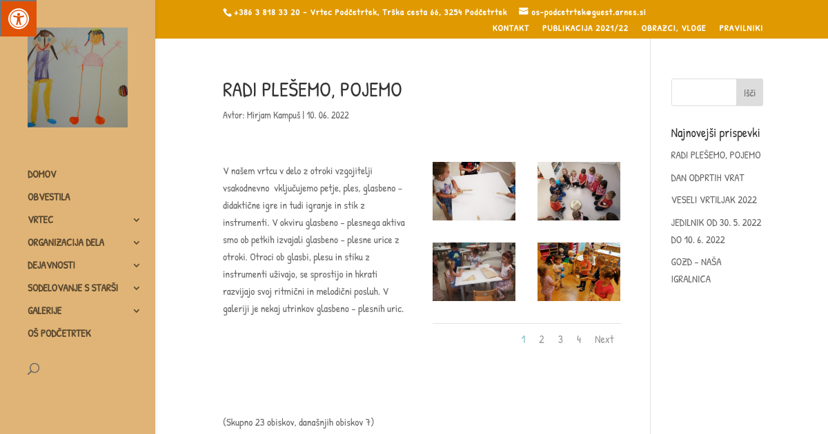 V našem vrtcu v delo z otroki vzgojitelji vsakodnevno vključujemo petje, ples, glasbeno – didaktične igre in tudi igranje in stik z instrumenti. V okviru glasbeno – plesnega aktiva smo ob petkih izvajali glasbeno – plesne urice z otroki. Otroci ob glasbi, plesu in stiku z instrumenti uživajo, se sprostijo in hkrati razvijajo svoj ritmični in melodični posluh. V galeriji je nekaj utrinkov glasbeno – plesnih uric.