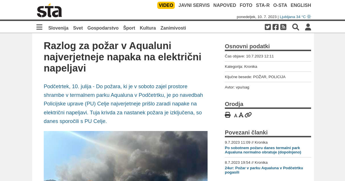 Do požara, ki je v soboto zajel prostore shrambe v termalnem parku Aqualuna v Podčetrtku, je po navedbah Policijske uprave (PU) Celje najverjetneje prišlo zaradi napake na električni napeljavi. Tuja krivda za nastanek požara je izključena, so danes sporočili s PU Celje.