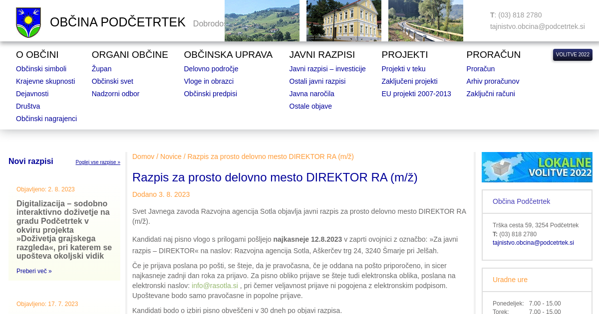 Svet Javnega zavoda Razvojna agencija Sotla objavlja javni razpis za prosto delovno mesto DIREKTOR RA (m/ž). Kandidati naj pisno vlogo s prilogami pošljejo najkasneje 12.8.2023 v zaprti ovojnici z označbo: »Za javni razpis – DIREKTOR« na naslov: Razvojna agencija Sotla, Aškerčev trg 24, 3240 Šmarje pri Jelšah. Če je prijava poslana po pošti, se šteje, da