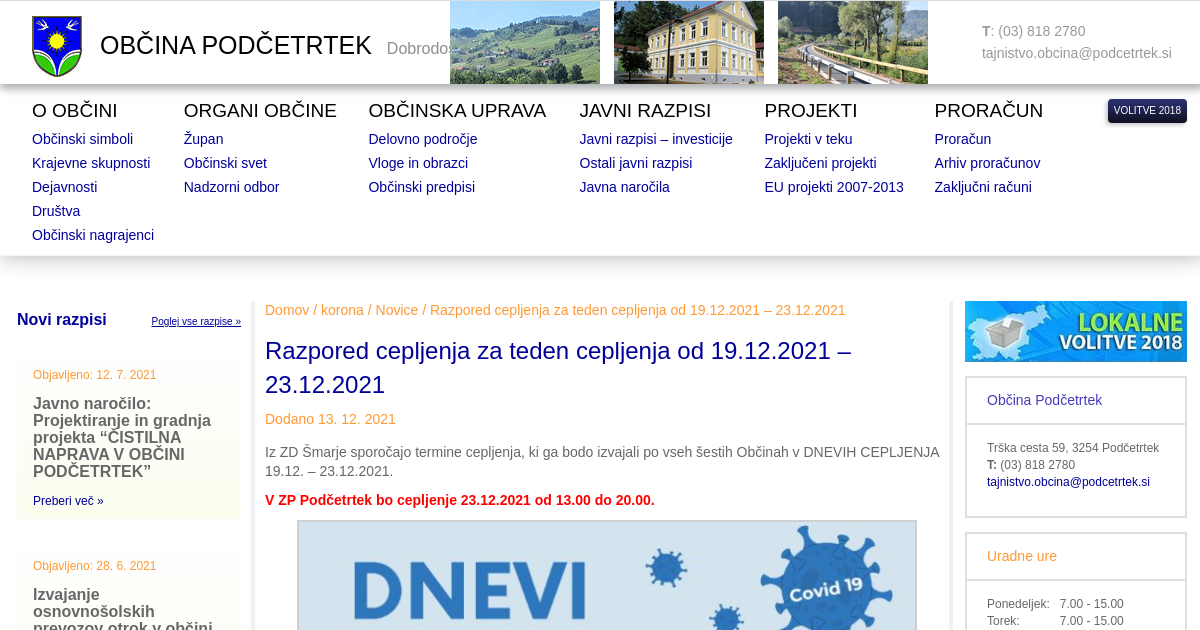 Iz ZD Šmarje sporočajo termine cepljenja, ki ga bodo izvajali po vseh šestih Občinah v DNEVIH CEPLJENJA 19.12. – 23.12.2021. V ZP Podčetrtek bo cepljenje 23.12.2021 od 13.00 do 20.00. Razpored vseh cepljenj: Priloga: Letak: Dnevi cepljenja 19.-23.12.2021