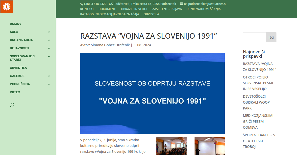 V ponedeljek, 3. junija, smo s kratko kulturno prireditvijo slovesno odprli razstavo »Vojna za Slovenijo 1991«, ki jo je pripravilo Policijsko veteransko društvo Sever za celjsko območje. Zbrane je uvodoma pozdravila ravnateljica Sonja Švajger. V svojem govoru je izpostavila pomen miru, kako bistven je za nas vse in kako ga lahko skupaj ohranjamo in krepimo. Podžupan Marko Jurak je poudaril, da vojna za Slovenijo ni bila le vojaški konflikt, ampak tudi dokaz naše odločenosti, da si izborimo lastno prihodnost in mesto med neodvisnimi državami sveta. Predsednik Policijskega veteranskega društva Sever za celjsko območje Milan Urbanček je predstavil, kdo pravzaprav so policijski vojni veterani, njihovo vlogo ter njihova prizadevanja k ohranjanju zgodovinskega spomina, resnice in vrednot, pomembnih za nastanek samostojne Republike Slovenije. Skozi razstavo je goste, učence in učitelje popeljal njen (so)snovalec generalni sekretar Zveze policijskih veteranskih društev Sever Anton Pozvek. Prireditev je glasbeno popestril Pihalni kvintet Orkestra Slovenske policije, učenci OPB so pod vodstvom Helene Smonkar razmišljali o domovini, Julija Strašek pa se je predstavila s pesmijo Toneta Pavčka. Program je povezovala Maja Pavčnik. V prostorih šole si lahko razstavo ogledate do 14. junija. Vljudno vabljeni!