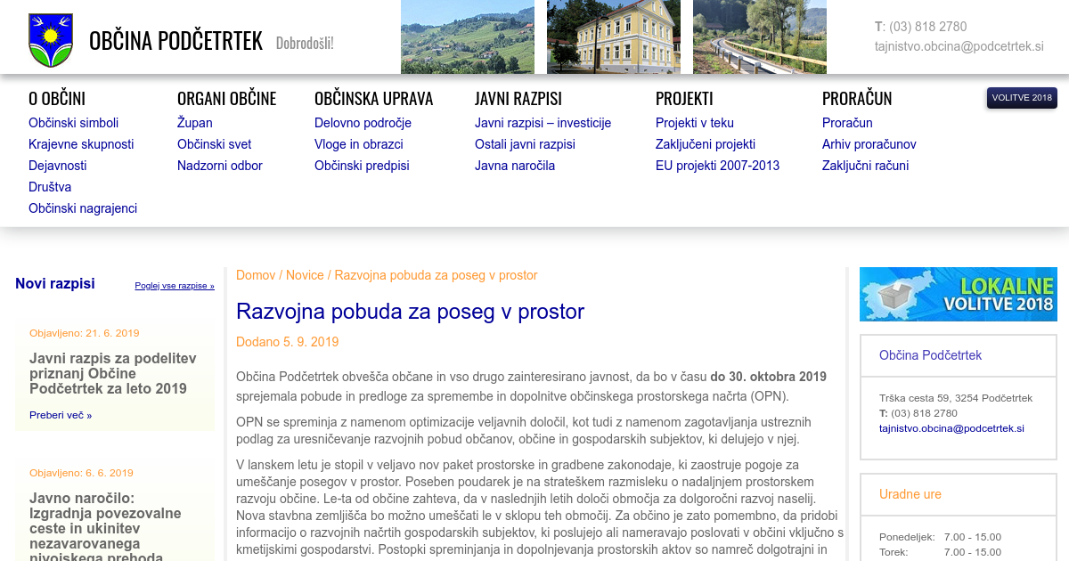 Občina Podčetrtek obvešča občane in vso drugo zainteresirano javnost, da bo v času do 30. oktobra 2019 sprejemala pobude in predloge za spremembe in dopolnitve občinskega prostorskega načrta (OPN). OPN se spreminja z namenom optimizacije veljavnih določil, kot tudi z namenom zagotavljanja ustreznih podlag za uresničevanje razvojnih pobud občanov, občine in gospodarskih subjektov, ki delujejo