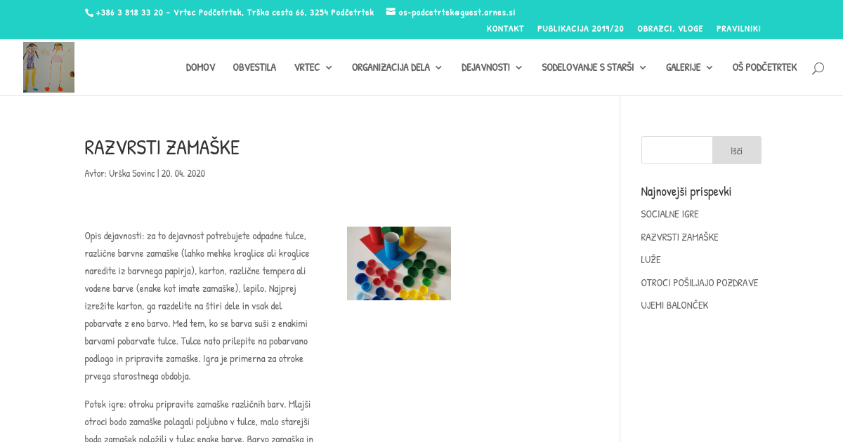 Opis dejavnosti: za to dejavnost potrebujete odpadne tulce, različne barvne zamaške (lahko mehke kroglice ali kroglice naredite iz barvnega papirja), karton, različne tempera ali vodene barve (enake kot imate zamaške), lepilo. Najprej izrežite karton, ga razdelite na štiri dele in vsak del pobarvate z eno barvo. Med tem, ko se barva suši z enakimi barvami pobarvate tulce. Tulce nato prilepite na pobarvano podlogo in pripravite zamaške. Igra je primerna za otroke prvega starostnega obdobja.