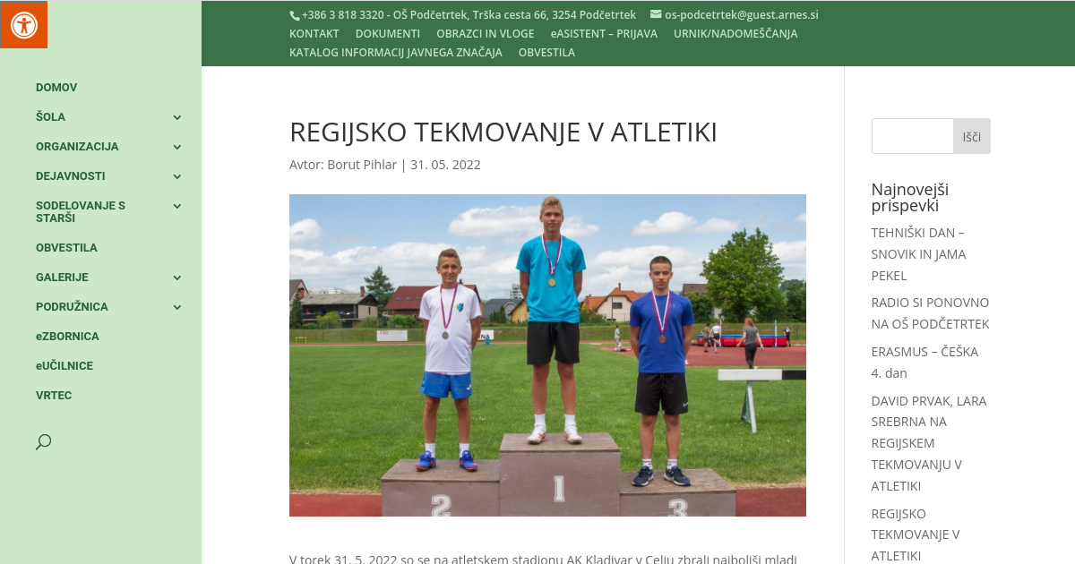 V torek 31. 5. 2022 so se na atletskem stadionu AK Kladivar v Celju zbrali najboljši mladi atleti celjske regije. Našo šolo je zastopalo 16 atletov in atletinj, ki so se ponovno odlično odrezali. David Jereb je z odličnim časom prepričljivo postal regijski prvak v teku na 300m med mlajšimi učenci, Lara Košir pa je osvojila drugo mesto v skoku v višino pri starejših učencih. Kmalu bodo znani tudi finalisti državnega tekmovanja, ki bo 8. 6. 2022 v Žalcu.