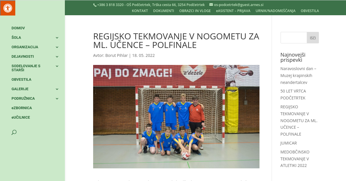Celje;18.5.2022. V dvorani Golovec je potekal polfinalni turnir v nogometu za mlajše učence. V prvi tekmi je naša ekipa premagala vrstnike iz OŠ Dramlje 4:0, v drugi tekmi pa igrala z ekipo OŠ Prebold neodločeno 3:3 in zaradi boljše gol razlike postala zmagovalka skupine. Naši nogometaši so se tako uvrstili na finalni turnir štirih najboljših ekip, ki bo v petek 20.5.2022, prav tako v dvorani Golovec. Našo ekipo so sestavljali: Lan Fajs Kovač, Tilen Boršič, David Jereb (kapetan), Lovro Bah Nenadič, Rok Šelekar, Žiga Sovinc, Tjan Jagrič in Aljaž Čokelc. Čestitke