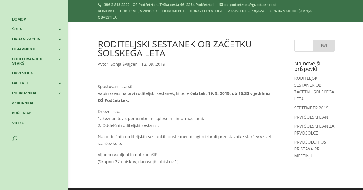Spoštovani starši! Vabimo vas na prvi roditeljski sestanek, ki bo v četrtek, 19. 9. 2019, ob 16.30 v jedilnici OŠ Podčetrtek.