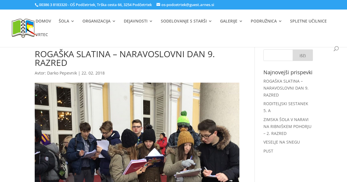 V torek 20.2.2018 smo učenci 9.a in 9.b razreda OŠ Podčetrtek odšli v Rogaško Slatino. Z avtobusom smo se odpeljali do Šolskega centra Rogaška Slatina. Pred šolo nas je pričakala profesorica, ki uči geografijo. Odpeljala nas je v eno izmed učilnic, kjer nas je pričakala malica. Medtem ko smo malicali, nas je prišla pozdravit tudi ravnateljica šole. Dijakinje 3. letnika so nam razdelile liste z vprašanji in karto Rogaške Slatine. Po malici smo se odpravili nazaj na avtobus in se odpeljali v stari del mesta. Med potjo pa smo izvedeli tudi nekaj o stvareh, ki se dogajajo v Rogaški Slatini. Ko smo prispeli v stari del mesta, smo se razdelili v dve skupini in hodili po parku. Ustavljali smo se na pomembnejših lokacijah, o katerih so nam dijakinje povedale veliko stvari, ki smo jih slišali na novo. Obiskali smo tudi Kristalno dvorano, Anino dvorano in enega izmed hotelov v Rogaški Slatini, ki ima pet zvezdic. Med potjo smo odgovarjali na vprašanja, ki so bila na delovnih listih. Ko smo končali z ogledom smo odšli v kavarno Central. Imeli smo nekaj prostega časa in ker je bilo zunaj mrzlo, smo popili nekaj toplega. Ob 11.00 smo se vrnili nazaj v šolo, kjer nas je pričakalo kosilo. Po končanem kosilu smo si ogledali še nekaj učilnic na šoli, nato pa smo se odpravili na avtobus in se odpeljali nazaj v šolo.
