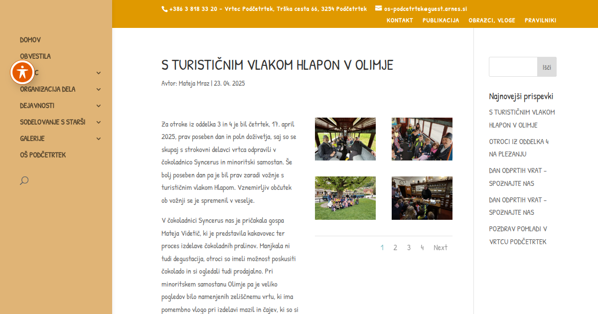 Za otroke iz oddelka 3 in 4 je bil četrtek, 17. april 2025, prav poseben dan in poln doživetja, saj so se skupaj s strokovni delavci vrtca odpravili v čokoladnico Syncerus in minoritski samostan. Še bolj poseben dan pa je bil prav zaradi vožnje s turističnim vlakom Hlapom. Vznemirljiv občutek ob vožnji se je spremenil v veselje.
