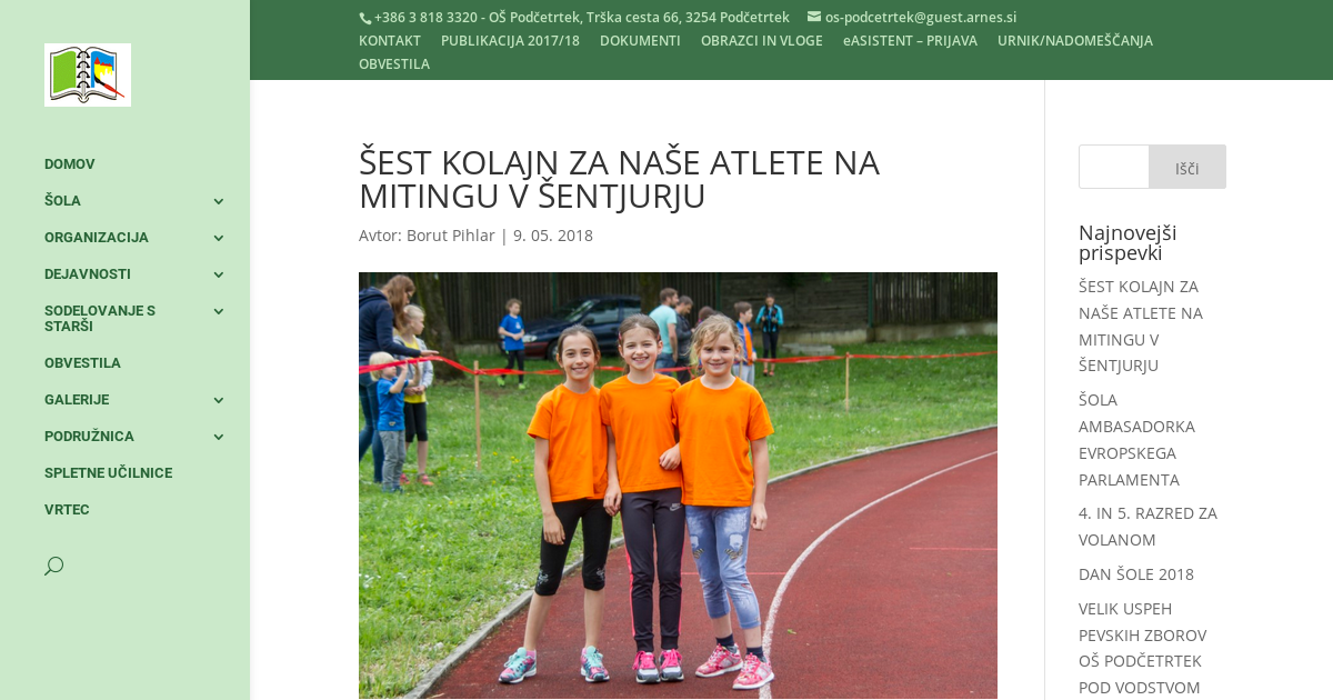 V soboto 5. maja se je petnajst naših mladih atletov udeležilo tradicionalnega XV. atletskega mitinga v Šentjurju, kjer je sodelovalo več kot 260 tekmovalcev iz celotne Slovenije. Naši atleti so kar šestkrat stopili na zmagovalne stopničke. GAŠPER REBERNIK 1. mesto v skoku v daljino, NEJC ŠTAHL 2. mesto v teku na 200 m, EMA OSOJNIK, LARA KOŠIR in MAURITS SCHMIT 3. mesto v metu vortexa, ter TILEN BORŠIČ v teku na 60 m.