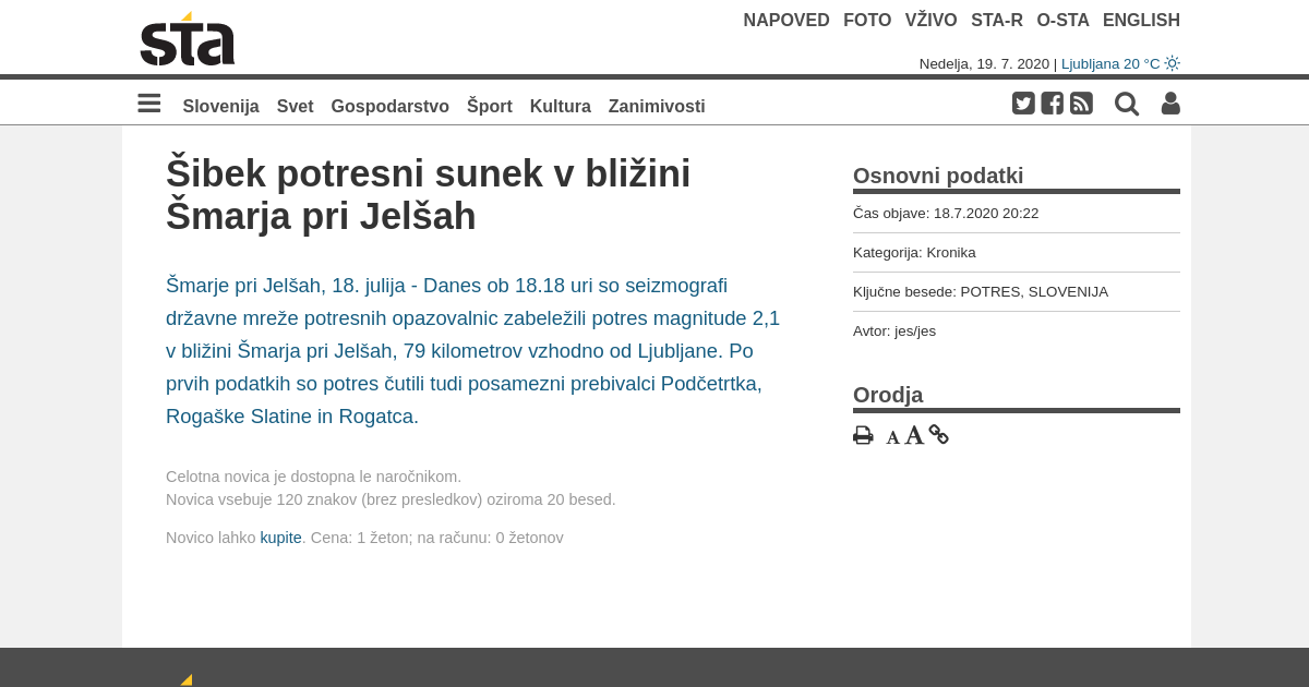 Danes ob 18.18 uri so seizmografi državne mreže potresnih opazovalnic zabeležili potres magnitude 2,1 v bližini Šmarja pri Jelšah, 79 kilometrov vzhodno od Ljubljane. Po prvih podatkih so potres čutili tudi posamezni prebivalci Podčetrtka, Rogaške Slatine in Rogatca.
