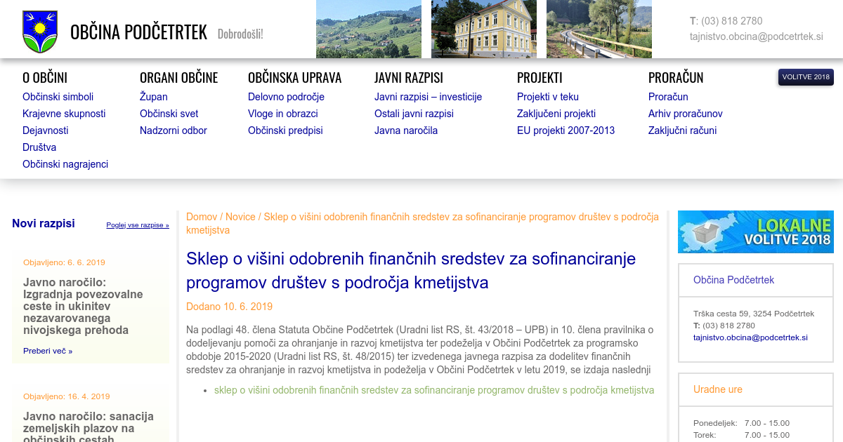 Na podlagi 48. člena Statuta Občine Podčetrtek (Uradni list RS, št. 43/2018 – UPB) in 10. člena pravilnika o dodeljevanju pomoči za ohranjanje in razvoj kmetijstva ter podeželja v Občini Podčetrtek za programsko obdobje 2015-2020 (Uradni list RS, št. 48/2015) ter izvedenega javnega razpisa za dodelitev finančnih sredstev za ohranjanje in razvoj kmetijstva in podeželja