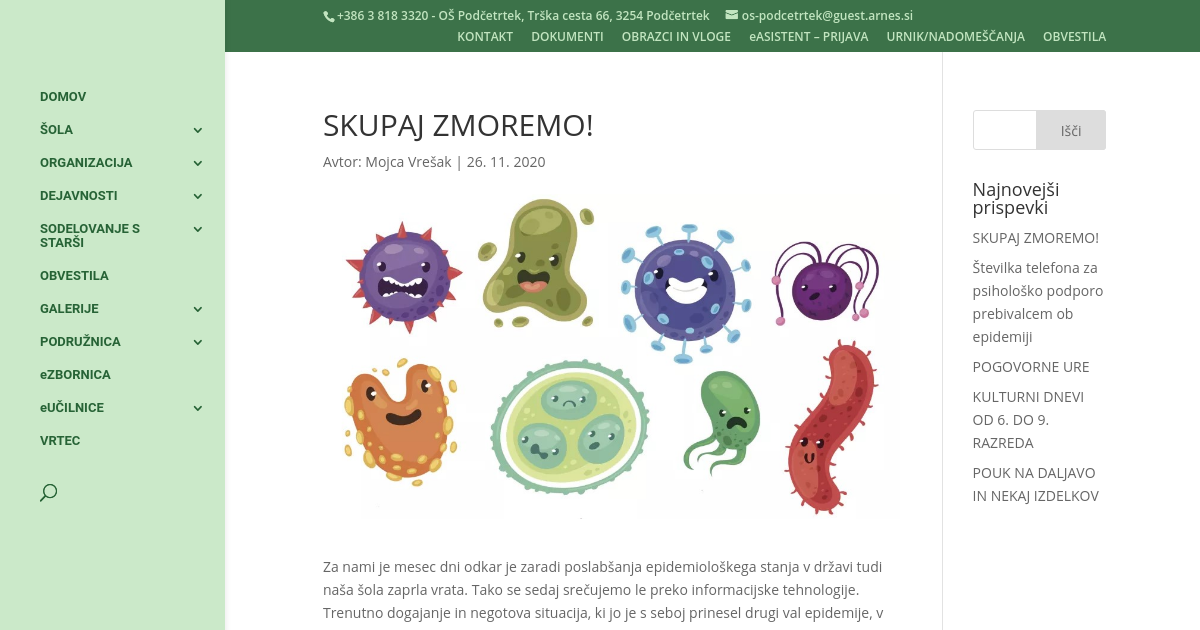 Za nami je mesec dni odkar je zaradi poslabšanja epidemiološkega stanja v državi tudi naša šola zaprla vrata. Tako se sedaj srečujemo le preko informacijske tehnologije. Trenutno dogajanje in negotova situacija, ki jo je s seboj prinesel drugi val epidemije, v mnogih povzroča občutek nemoči in negotovosti. Znašli smo se v času, v katerem smo vsi skupaj in je za vse neprijeten ter negotov… SKUPAJ ZMOREMO