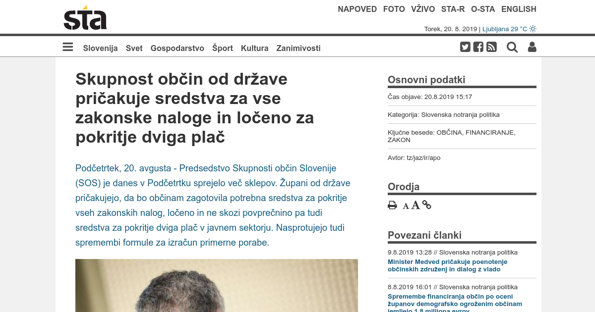 Predsedstvo Skupnosti občin Slovenije (SOS) je danes v Podčetrtku sprejelo več sklepov. Župani od države pričakujejo, da bo občinam zagotovila potrebna sredstva za pokritje vseh zakonskih nalog, ločeno in ne skozi povprečnino pa tudi sredstva za pokritje dviga plač v javnem sektorju. Nasprotujejo tudi spremembi formule za izračun primerne porabe.