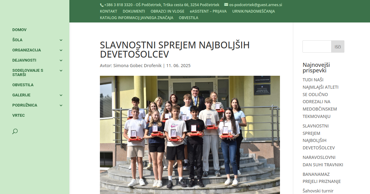 V sredo, 11. junija, je župan Peter Misja v prostorih občine s ponosom sprejel devetošolce, ki so vseh devet let osnovnega šolanja dosegali odličen učni uspeh ter izkazali izjemne dosežke na različnih področjih. V slavnostnem nagovoru jim je izrekel iskrene čestitke in pohvale za njihovo prizadevnost, vztrajnost ter zgledno delo. Ob tem jih je spodbudil, naj tudi v prihodnje sledijo svojim ciljem, ter jih povabil, da se po zaključku nadaljnjega izobraževanja vrnejo v domači kraj in s svojim znanjem prispevajo k razvoju skupnosti. Spodbudne misli in zahvalo za njihov trud jim je namenila tudi ravnateljica Sonja Švajger, ki je poudarila pomen vrednot, vzgoje in znanja, ki jih učenci odnašajo s seboj na nadaljnjo življenjsko pot. V znak priznanja so učenci prejeli zlate petke in simbolična darila, kot zahvalo za svoje delo ter spodbudo za prihodnost. Slavnostnega sprejema so se udeležili Lucija Brezovec, Sašo Cverlin, Lara Drofenik, Julija Flajnik, Melani Gobec, Tjan Jagrič, Tilen Lončarič, Petra Mrkša, Dejan Ocvirk, Maja Pavčnik, Matic Plevnik in Vid Drofenik.