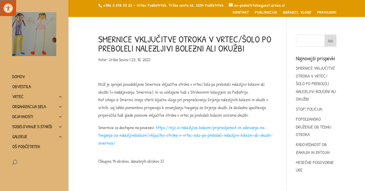 NIJZ je sprejel posodobljene Smernice vključitve otroka v vrtec/šolo po preboleli nalezljivi bolezni ali okužbi (v nadaljevanju: Smernice), ki so usklajene tudi s Strokovnim kolegijem za Pediatrijo. Kot izhaja iz Smernic imajo starši ključno vlogo pri preprečevanju širjenja nalezljivih bolezni in okužb v vrtcih, saj lahko pomembno prispevajo k zmanjšanju tveganja za širjenje okužb, če dosledno upoštevajo priporočila tudi glede ponovne vključitve otroka v vrtec po preboleli bolezni oziroma okužbi.