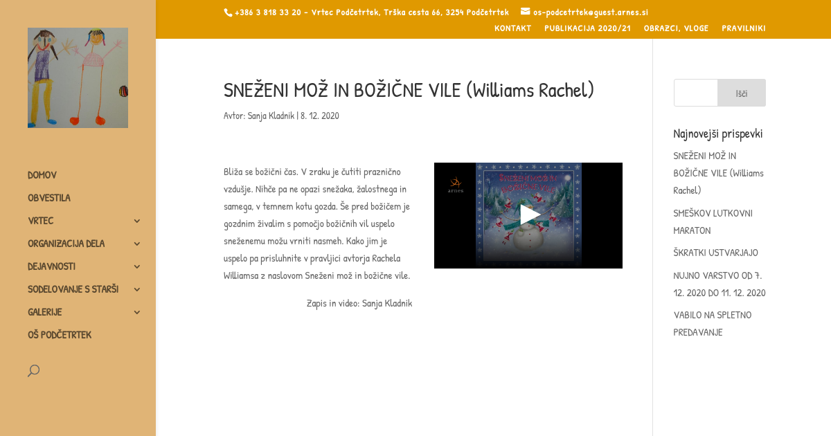 Bliža se božični čas. V zraku je čutiti praznično vzdušje. Nihče pa ne opazi snežaka, žalostnega in samega, v temnem kotu gozda. Še pred božičem je gozdnim živalim s pomočjo božičnih vil uspelo sneženemu možu vrniti nasmeh. Kako jim je uspelo pa prisluhnite v pravljici avtorja Rachela Williamsa z naslovom Sneženi mož in božične vile.