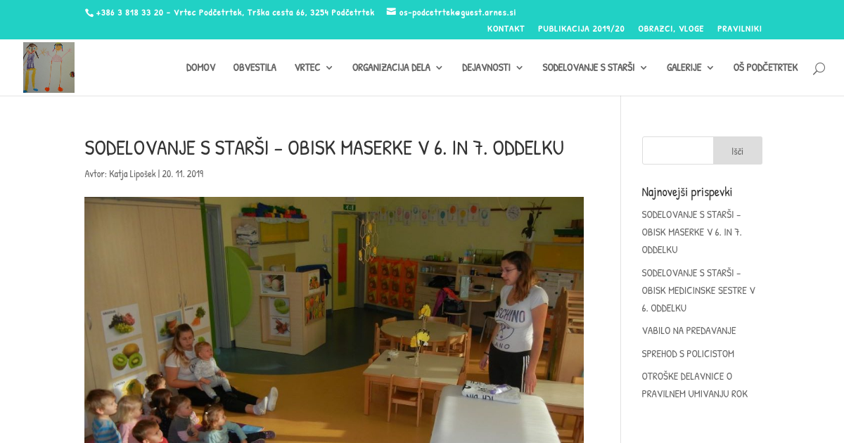 V torek, 19. 11. 2019, smo se otroci 7. in 6. oddelka zbrali v 6. oddelku, saj nas je nas je obiskala maserka, gospa Barbara Vreže, mama deklice, ki obiskuje 6. oddelek. Prednostna naloga vrtca v tem šolskem letu je »Naše zdravje – naša skrb« in ker se v obeh oddelkih pogovarjamo, izvajamo razne dejavnosti na to prednostno nalogo, smo povabili v vrtec gospo Barbaro. Ta se je našemu povabilu prijazno odzvala. S seboj je prinesla masažno mizo, ki jo je razstavila pred otroki ter masažno olje, s katerim je otrokom, ki so to želeli, zmasirala roke ter noge. Pred masažo otrok, je gospa Barbara poskrbela za demonstracijo masaže. Najpogumnejši so se prepustili masaži rok in nog ob prijetni sproščujoči glasbi. Gospe Barbari se lepo zahvaljujemo za obisk.