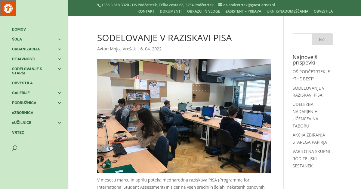 V mesecu marcu in aprilu poteka mednarodna raziskava PISA (Programme for International Student Assessment) in sicer na vseh srednjih šolah, nekaterih osnovnih šolah in ustanovah za izobraževanje odraslih. Med izbranimi šolami je v tem ciklu tudi naša osnovna šola. V raziskavi sodelujejo 15-letni učenci in učenke iz 85 držav po svetu. Ta mednarodna raziskava bralne, matematične in naravoslovne pismenosti poteka v triletnih ciklih. Raziskava PISA meri znanja, ki jih mladi potrebujejo v svojem življenju in ta znanja niso nujno vezana na znanja, pridobljena v šoli, ampak so jih lahko pridobili tudi drugje. V Sloveniji jo izvaja Pedagoški inštitut po naročilu Ministrstva za izobraževanje, znanost in šport. Pedagoški inštitut je po posebni metodi izbral 4 učence naše šole, ki so v tej raziskavi sodelovali.