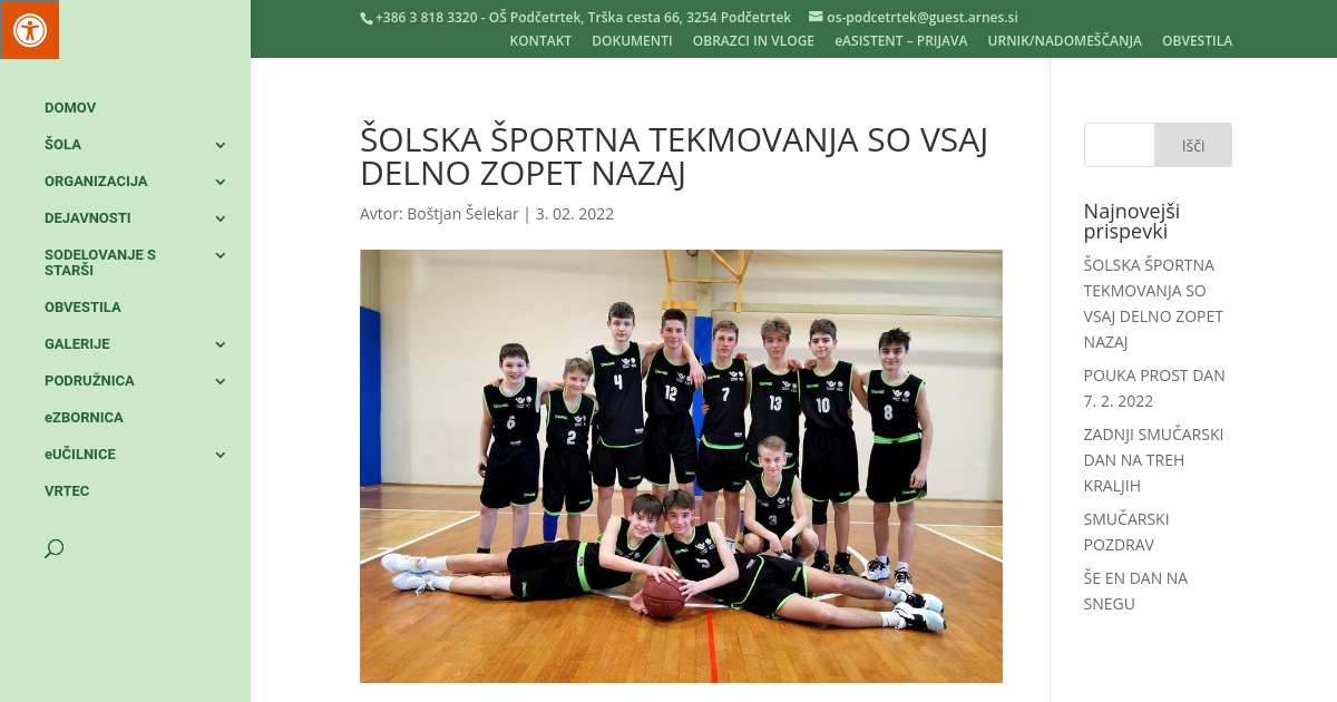 Po skoraj dveh letih premora, kjer šolskih športnih tekmovanj zaradi epidemiološke situacije v državi ni bilo, so se prvi na tekmovališča vrnili naši košarkarji. Starejši učenci so se tako udeležili tekme na OŠ Šmarje pri Jelšah, kjer so se pomerili s tamkajšnjimi vrstniki in po napeti končnici zmagali z 51:56. Želja vseh nas je seveda, da se tekmovanja čim prej vrnejo nazaj in upamo, da je ta tekma nekakšna znanilka novega začetka šolske športne tekmovalne pomladi.