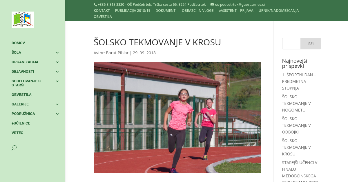 V petek, 28. septembra, smo v okviru športnega dneva izvedli šolsko tekmovanje v krosu. Najuspešnejši se bodo udeležili medobčinskega tekmovanja, ki bo 2. oktobra v Lesičnem. REZULTATI ŠOLSKEGA TEKMOVANJA V KROSU