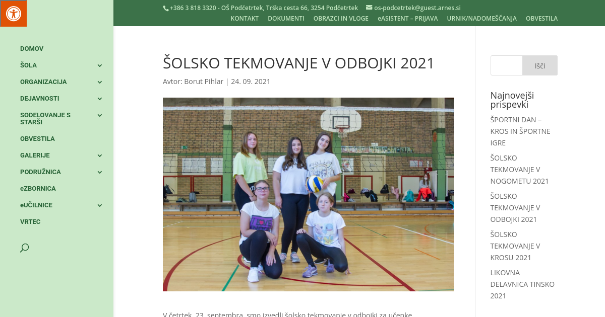 V četrtek, 23. septembra, smo izvedli šolsko tekmovanje v odbojki za učenke. REZULTATI ŠOLSKEGA TEKMOVANJA V ODBOJKI