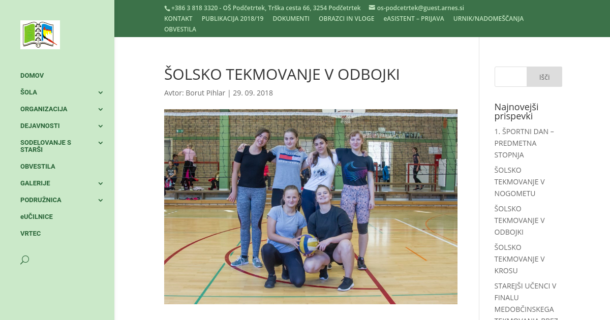 V petek, 28. septembra, smo izvedli šolsko tekmovanje v odbojki za učenke. REZULTATI ŠOLSKEGA TEKMOVANJA V ODBOJKI