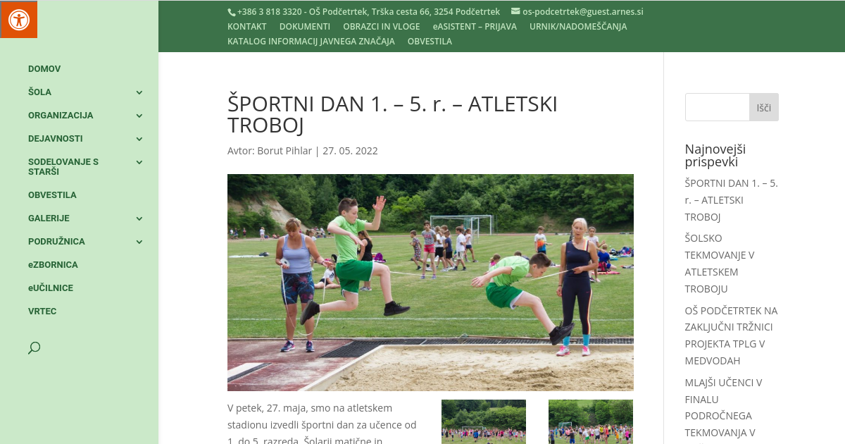 V petek, 27. maja, smo na atletskem stadionu izvedli športni dan za učence od 1, do 5. razreda. Šolarji matične in podružnične osnovne šole so se pomerili v atletskem troboju, ki zajema discipline tek na 60 metrov, met vorteksa in skok v daljino. Vrstni red najboljših v posameznih kategorijah si lahko pogledate na povezavi REZULTATI
