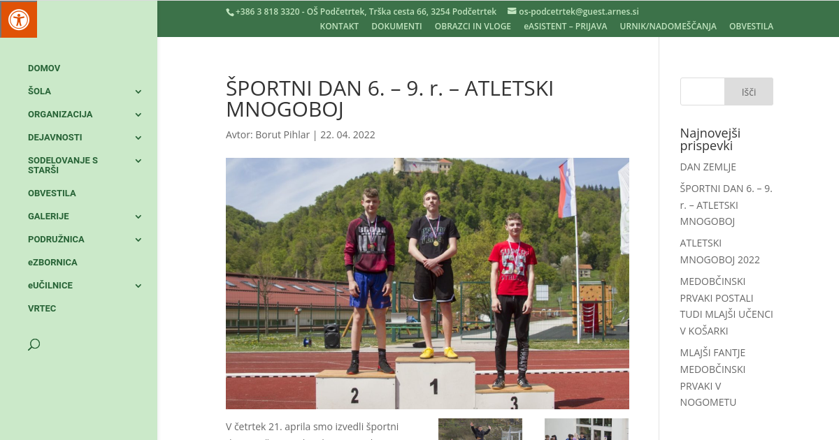 V četrtek 21. aprila smo izvedli športni dan za učence od 6, do 9. razreda. Vsebina športnega dne je bil atletski mnogoboj. Učenci in učenke 6. in 7. razreda so se pomerili v petih atletskih disciplinah, teku na 60 in 300 m, skoku v daljino in višino ter metu vortexa. Učenci in učenke 8. in 9. razreda pa še dodatno v suvanju krogle. Vrstni red najboljših v posameznih kategorijah si lahko pogledate v rubriki ŠPORT – TEKMOVANJA – ATLETIKA.