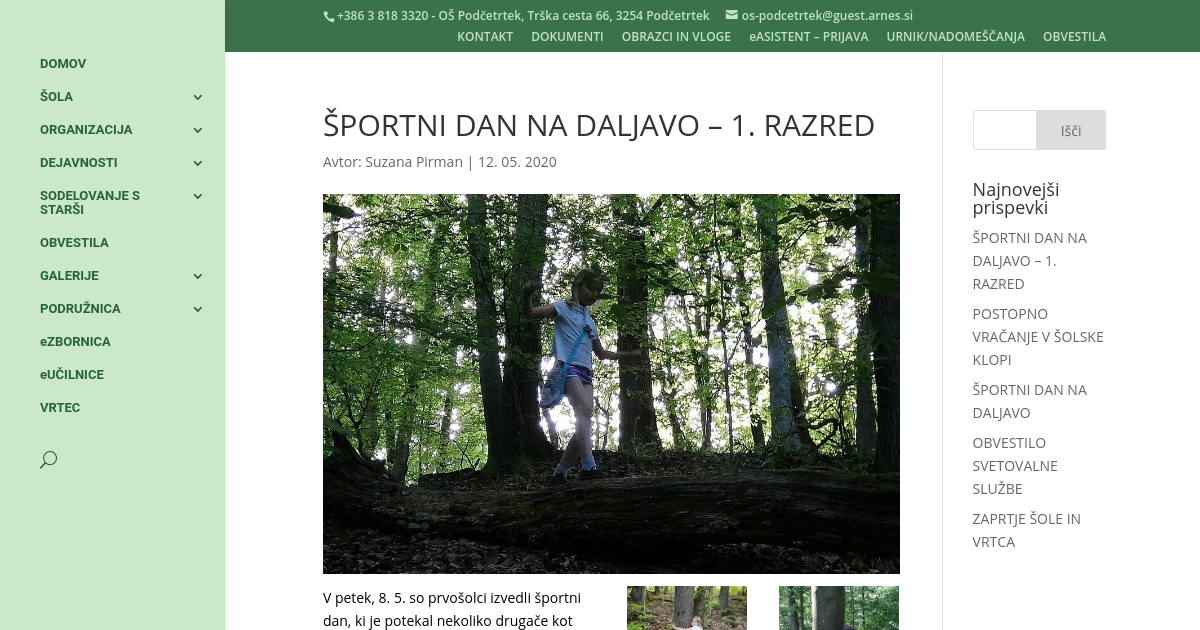 V petek, 8. 5. so prvošolci izvedli športni dan, ki je potekal nekoliko drugače kot običajni športni dnevi, učenci so ga namreč namesto s sošolci, izvedli s svojimi družinskimi člani. Tema športnega dne je bila POHODNIŠTVO, IGRE V NARAVI TER SKRB ZA ZDRAVJE. Učenci so si skupaj s starši izbrali pohodniški cilj. Med potjo so opravljali različne aktivnosti v naravi: tekali okrog dreves, preskakovali jarke, manjše potoke, stopali na štor, hodili po podrtem deblu…opazovali so naravo, lepote domačega kraja, poslušali ptičje petje, objeli svoje drevo. Na pohodu so prišli do ugotovitev, da je zelo pomembo, da spoštujemo naravo, ne vznemirjamo živali, ne uničujemo rastlinja, ter vse svoje smeti odnesemo s seboj.