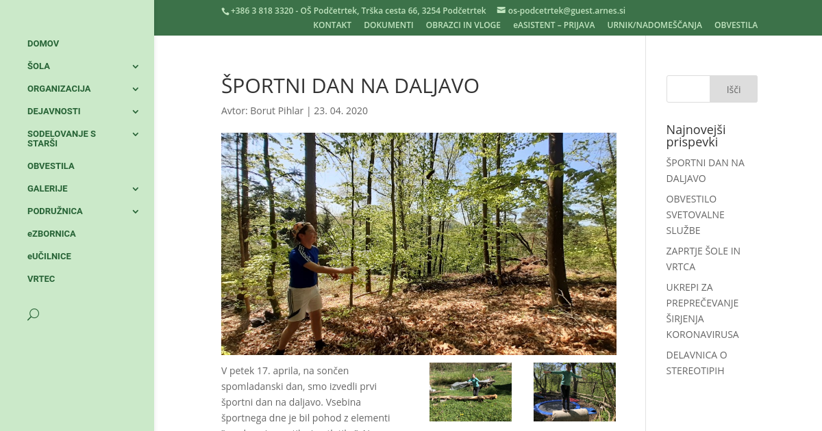 V petek 17. aprila, na sončen spomladanski dan, smo izvedli prvi športni dan na daljavo. Vsebina športnega dne je bil pohod z elementi ”gozdne gimnastike in atletike”. Nova izkušnja za vse nas. Po odzivu učencev, so le ti najbolj pogrešali družbo sošolcev, po drugi strani pa preživeli prijeten dan v naravi skupaj z družino in bolj pozorno opazovali prebujajočo se naravo in lepote domačega kraja. Mnogi so sporočili, da bodo takšen dan še večkrat ponovili. Nekaj utrinkov si lahko pogledate v fotogaleriji.