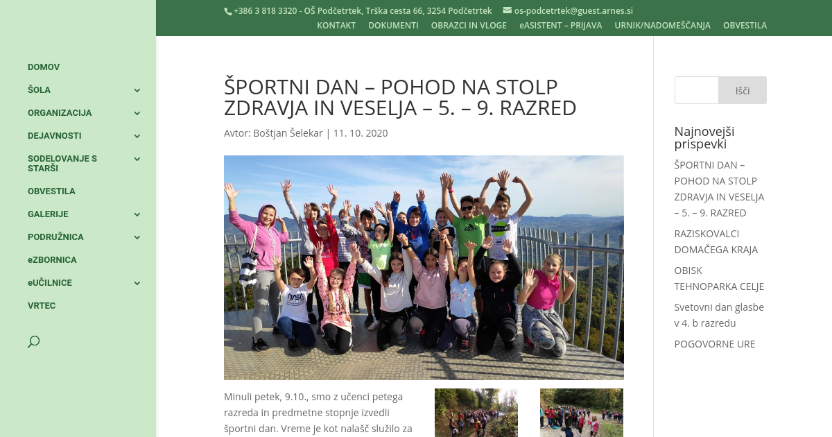 Minuli petek, 9.10., smo z učenci petega razreda in predmetne stopnje izvedli športni dan. Vreme je kot nalašč služilo za prijeten jesenski pohod na Stolp zdravja in veselja. Vsi učenci so brez težav opravili vzpon do stolp, najpogumnejši pa so se povzpeli tudi do 35 metrov visoke razgledne ploščadi. Po vzponu je sledil še povratek nazaj v šolo. Veselilo je tudi dejstva, da se je lepo število učencev ta dan odločilo priti v šolo s kolesom in tako še dodatno dopolnili svoj športni dan.