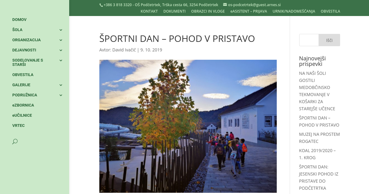 V sredo, 9. septembra smo imeli učenci od 1. do 4. razreda športni dan – JESENSKI POHOD. Odpravili smo se po gozdni poti do Term Olimia, potem pa po kolesarski stezi do parkirišča Termalnega parka Aqualuna, kjer smo se srečali z učenci pristavške šole, skupaj pomalicali in se malo pogovorili. Pot smo nadaljevali do Pristave in se na igrišču še poigrali. Z avtobusom smo se vsi veseli, polni lepih vtisov v lepem jesenskem dnevu vrnili v šolo.