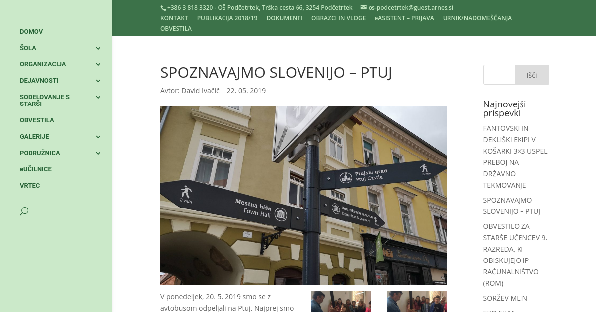 V ponedeljek, 20. 5. 2019 smo se z avtobusom odpeljali na Ptuj. Najprej smo si ogledali Ptujski grad. Poslopje je odlično ohranjeno in privlačno na pogled. Videli smo tradicionalne pustne maske in stara glasbila. Ogledali smo si pohištvo, zajetno zbirko slik ter druge zanimive predmete. Nato smo se razdelili v tri skupine in si ob vodstvu vodičk ogledali staro mestno jedro. Za zaključek smo se še posladkali s sladoledom.