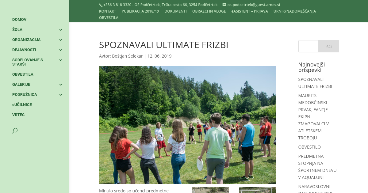 Minulo sredo so učenci predmetne stopnje pri rednih urah športa spoznavali medijsko nekoliko manj poznan šport, a vseeno zelo atraktivno disciplino – ultimate frizbi. Gre za brezkontakten ekipni šport, ki se igra s pomočjo diska. Lahko se igra na mivki, v dvorani ali na travi. Ekipe osvojijo točko, ko dosežejo zaključeno (ujeto) podajo v nasprotnikovi končni coni. Posebnost ultimatea je tudi to, da na tekmah ni sodnikov. Igralci torej sami rešujejo spore, za kar je zelo pomemben športni duh. Predstavitev športne panoge je bila zelo zanimiva za kar gredo zasluge Maticu Kuselju iz frizbi zveze, ki je tudi kapetan naše državne reprezentance v tem športu. Pridobljeno znanje o tem športu bo zagotovo prišlo zelo prav, saj bomo ta šport vsekakor vključevali v naš letni učni načrt v prihodnjih šolskih letih.
